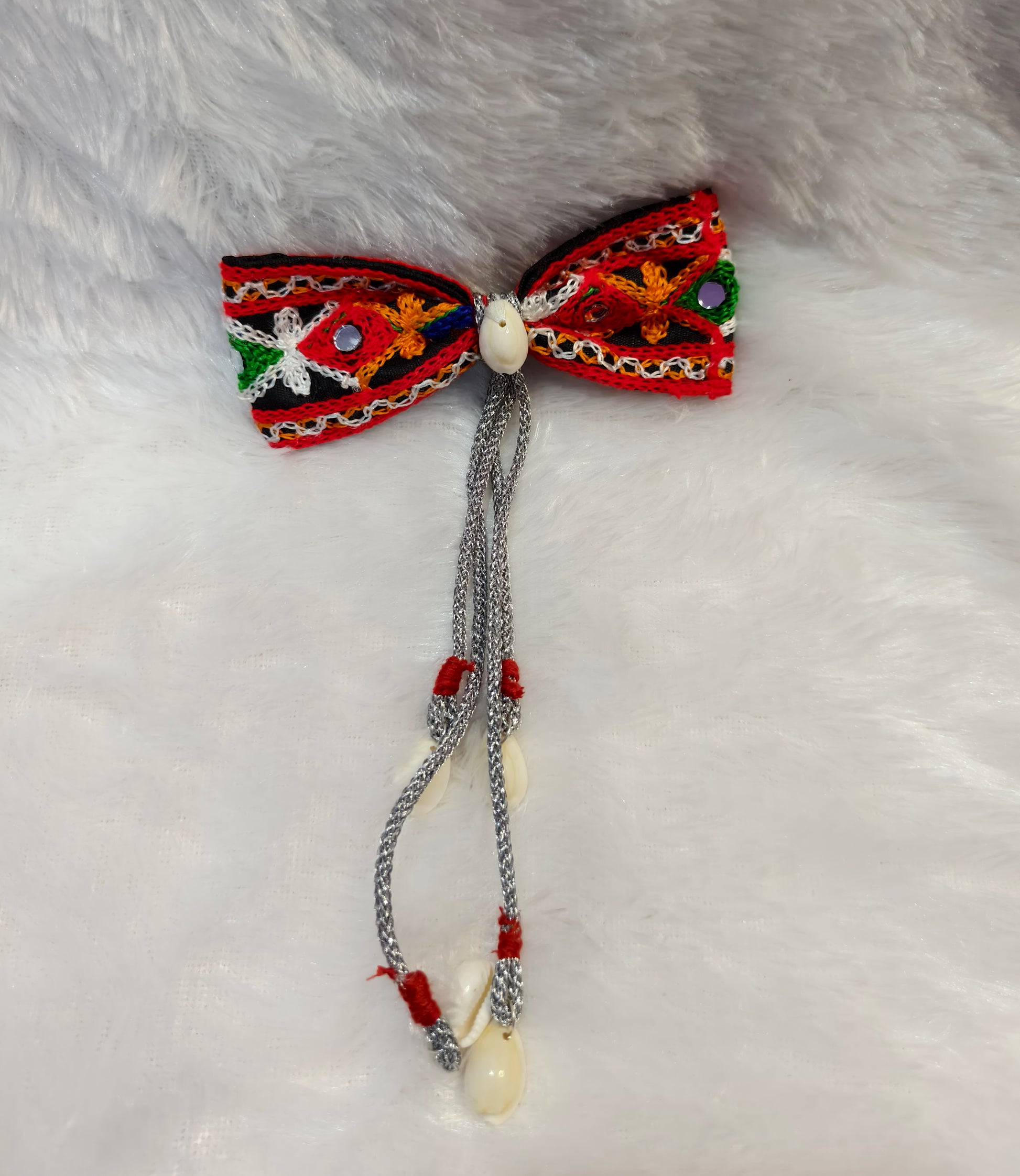 Add a touch of ethnic elegance to your look with this handcrafted embroidered bow. Designed with vibrant thread work and mirror details, it is finished with cowrie shell tassels for a unique boho-traditional fusion. Perfect to style with ethnic outfits, festive looks, or even as a statement accessory for casual wear.