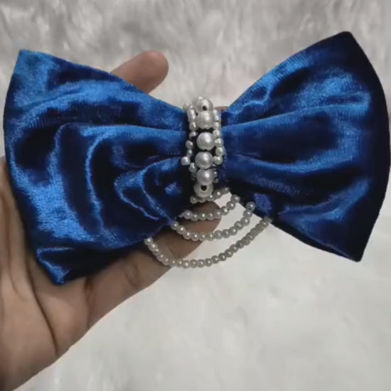 Royal Blue ππ Satin Hair Bow with Pearl Chain